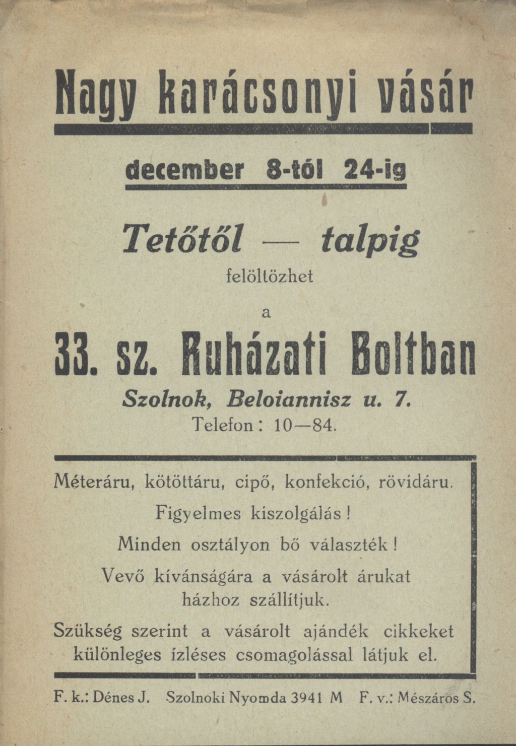 Karácsonyi vásár 1958. december 8-24. között, a hátoldalon a Szigligeti Színház decemberi műsora