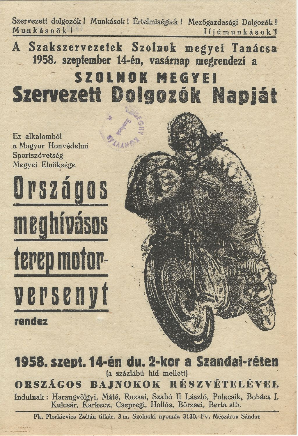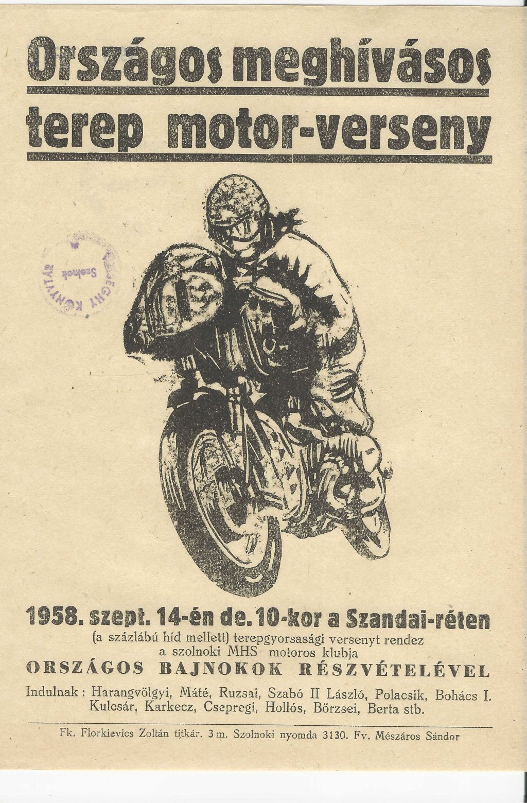 Országos meghívásos terep motor-verseny 1958. szeptember 14-én délelőtt 10 órakor a szolnoki Szandai-réten