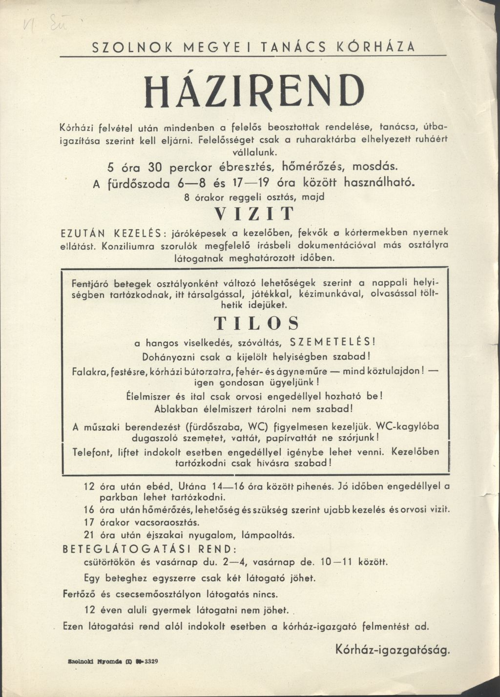 1958Szolnok Megyei Tanács Kórházának Házirendje