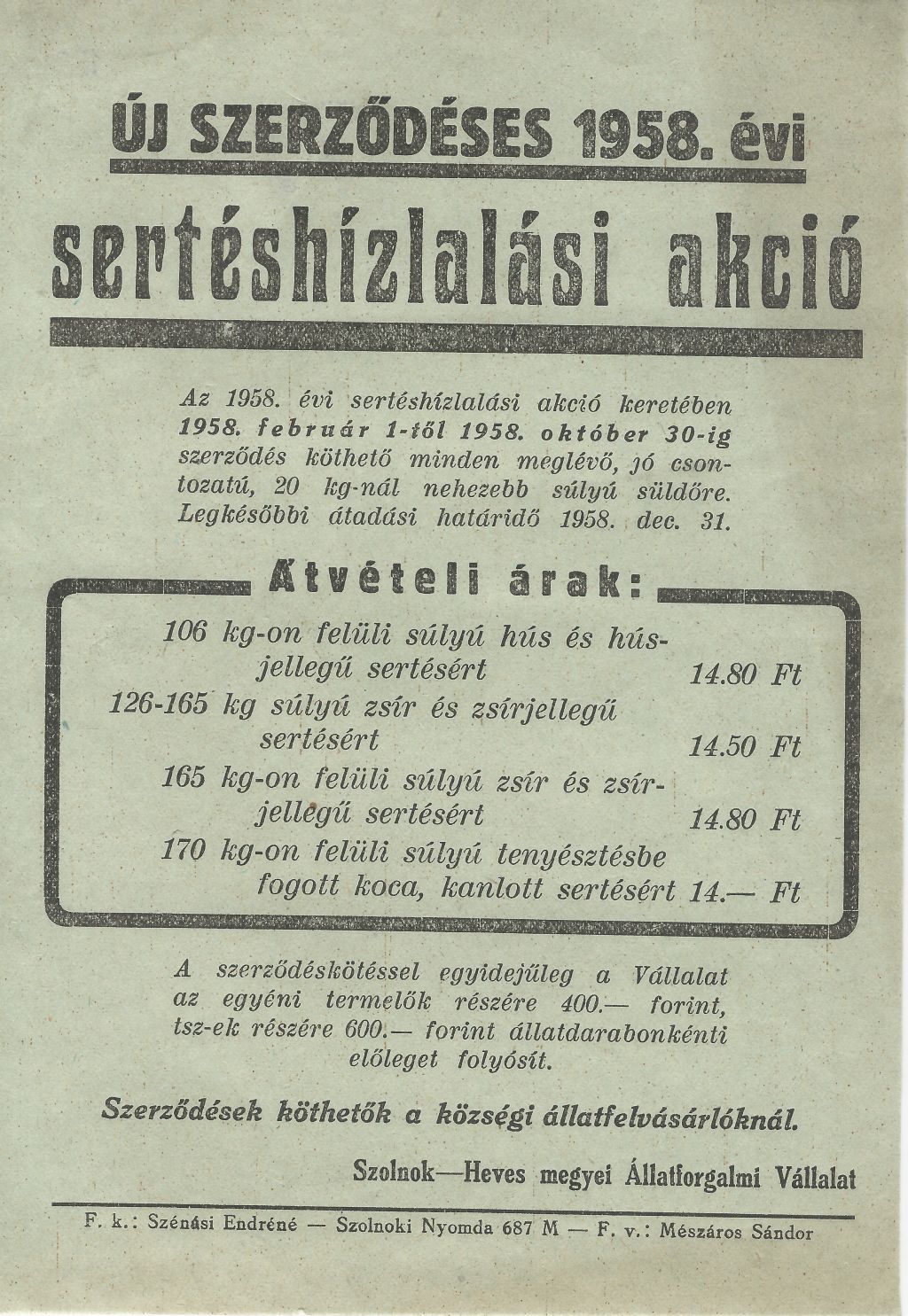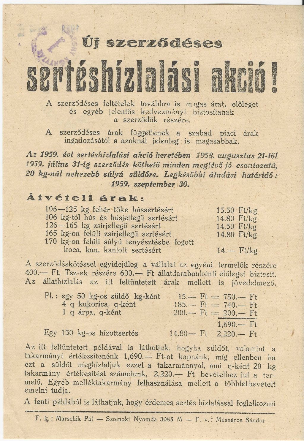 Új Szerződéses sertéshizlalási akció 1958. augusztus 21-től július 31-ig, legkésőbb 1958. szeptember 30-ig.