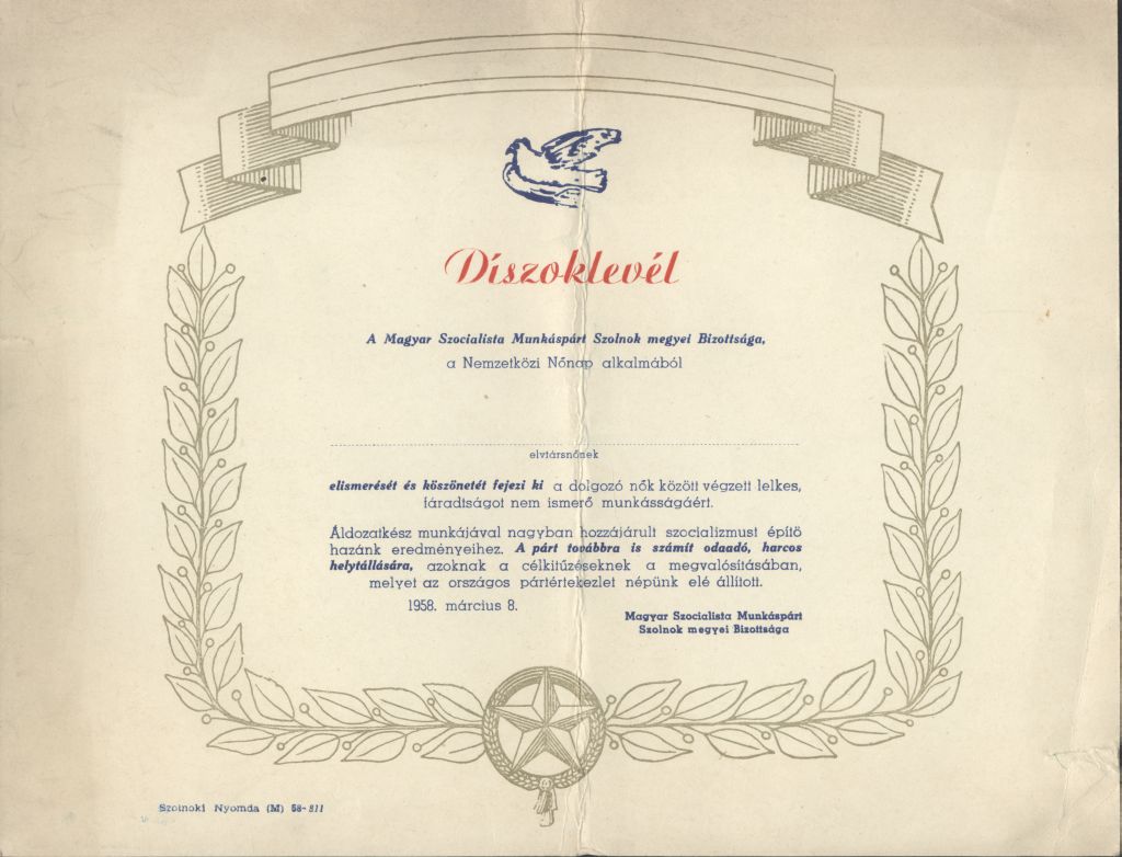 Az MSZMP Szolnok megyei Bizottságának Díszoklevele a Nemzetközi Nőnap alkalmából