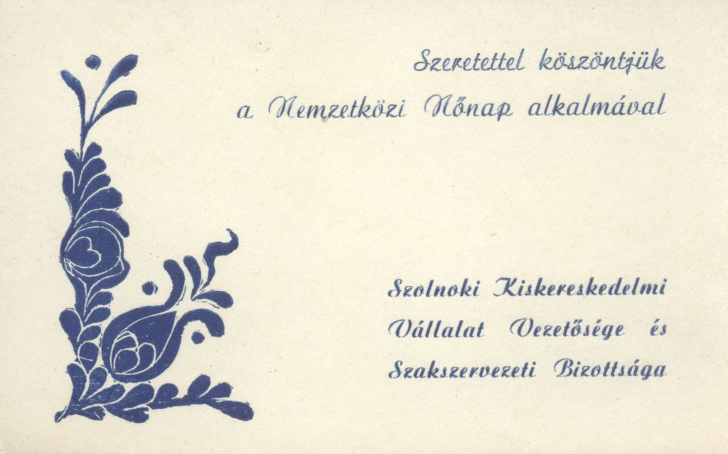 A szolnoki Kiskereskedelmi Vállalat Vezetőségének és Szakszervezeti Bizottságának Nőnapi köszöntő kártyája