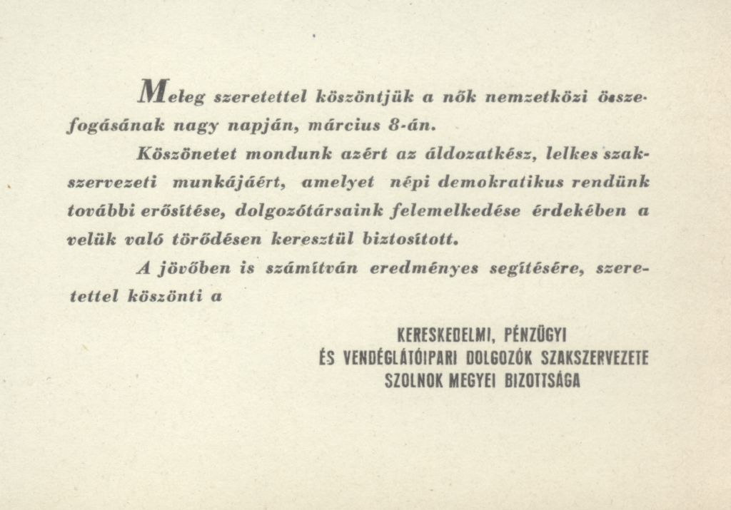 1958A Kereskedelmi, Pénzügyi és Vendéglátóipari Dolgozók Szakszervezete, Szolnok megyei Bizottságának Nőnapi köszöntő kártyája