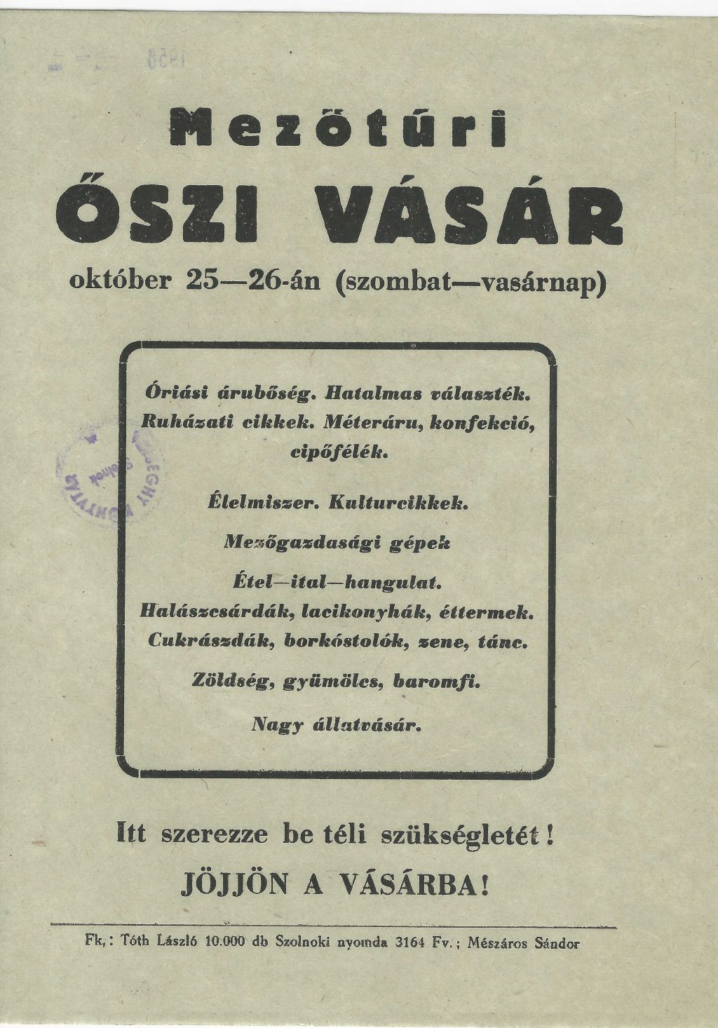 Őszi vásár Mezőtúron 1958. október 25-26. között