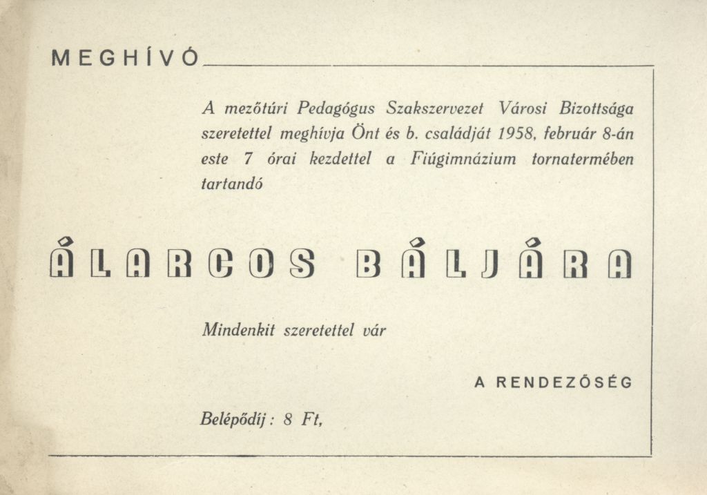 A mezőtúri Pedagógus Szakszervezet Városi Bizottságának meghívója álarcos bálra