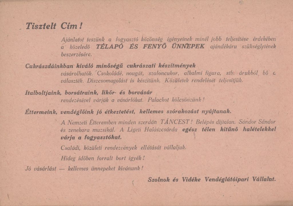 Szolnok és Vidéke Vendéglátóipari Vállalat kínálata a Télapó és Fenyő ünnepekre