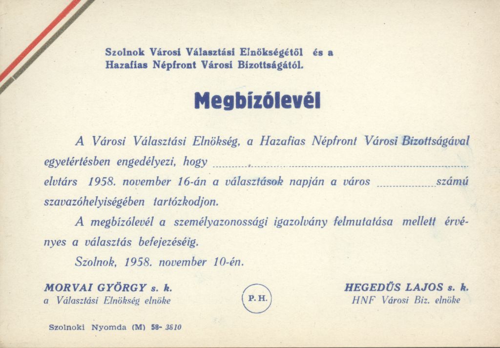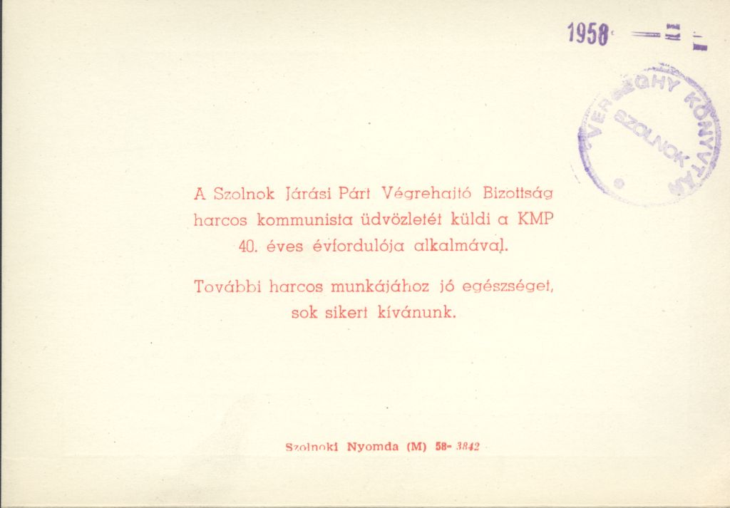 A Szolnok Járási Párt Végrehajtó Bizottsága harcos kommunista üdvözletét küldi a KMP 40. éves évfordulójára