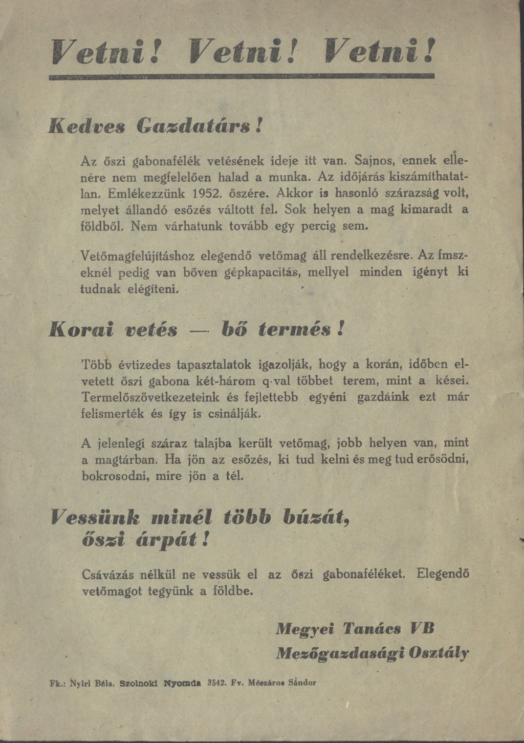 A Megyei Tanács VB Mezőgazdasági Osztály Mezőgazdasági tájékoztatója