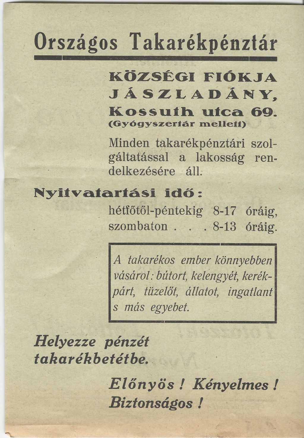 Országos Takarékpénztár Jászárokszállási fiókjának szórólapja