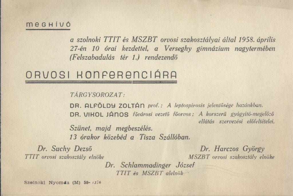Tudományos Ismeretterjesztő TársulatMeghívó a szolnoki Társadalom- és Természettudományi Ismeretterjesztő Társulat és a Magyar-Szovjet Baráti Társaság orvosi egészs