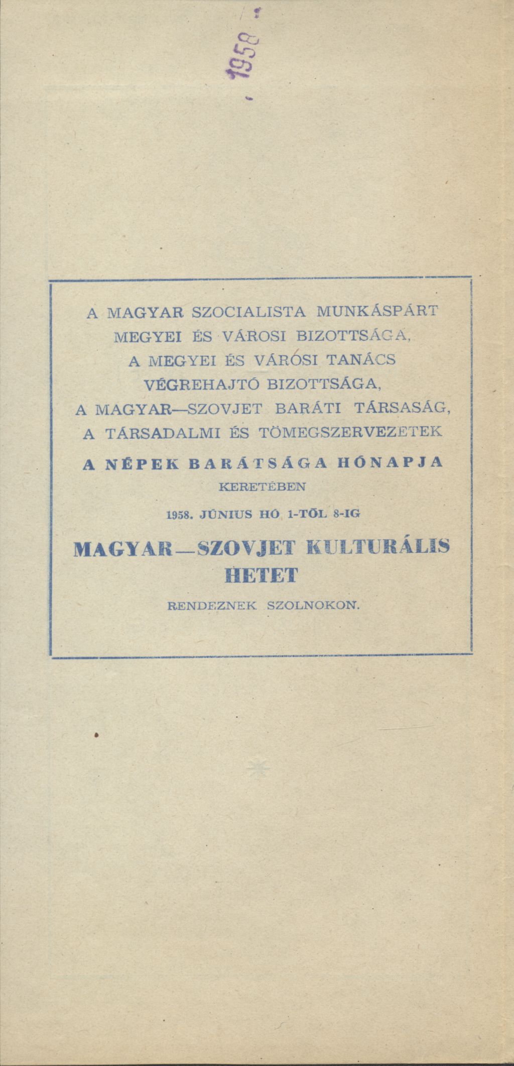 Magyar-Szovjet kulturális hét Szolnokon 1958. június 1-8. között