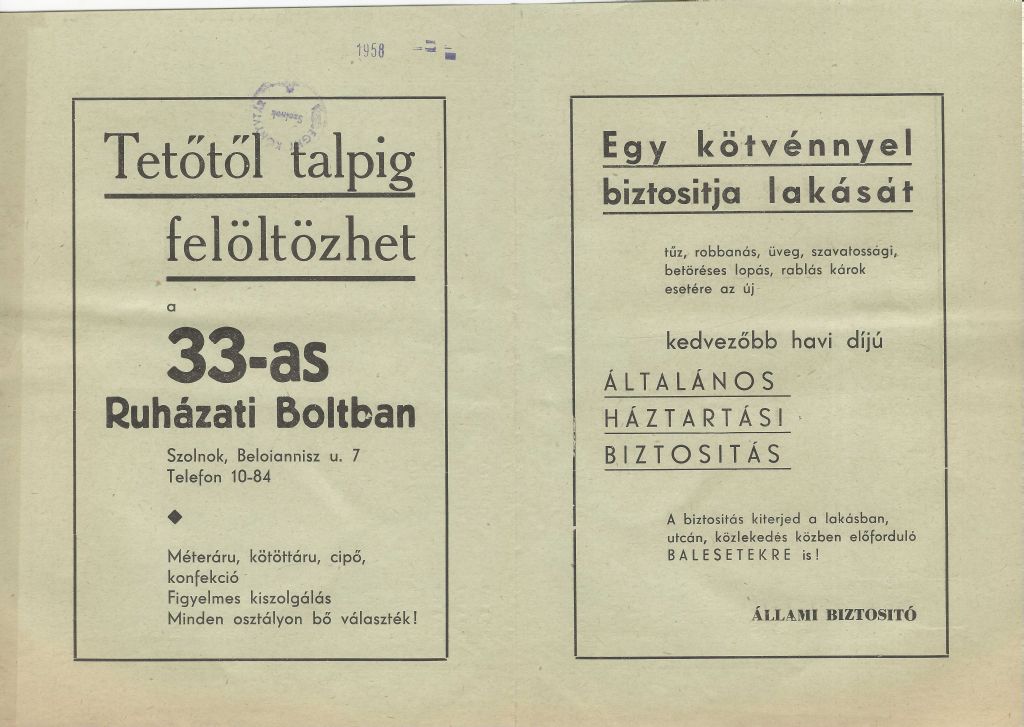 Állami Biztosító és a 33-as Ruházati bolt szórólapja