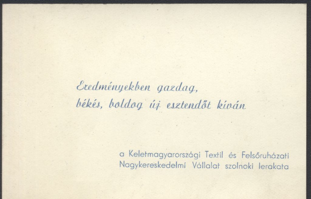 A Kelet-Magyarországi Textil és Felsőruházati Nagykereskedelmi Vállalat szolnoki lerakatának Újévi köszöntő kártyája