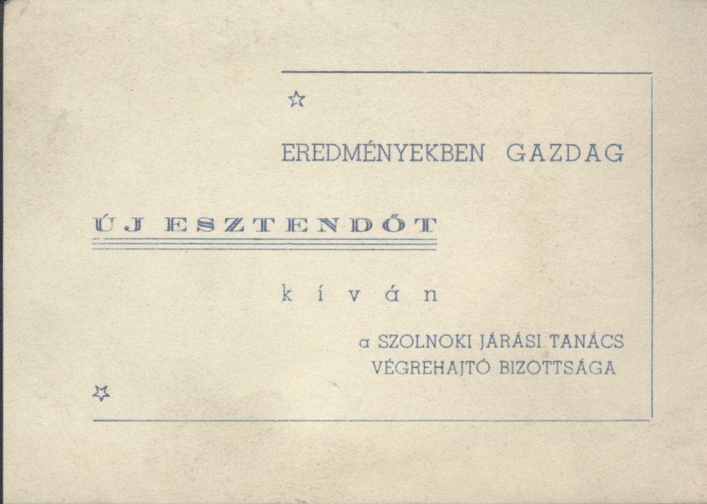 Újévi köszöntőkártyaA szolnoki Járási Tanács Végrehajtó Bizottságának Újévi köszöntő kártyája