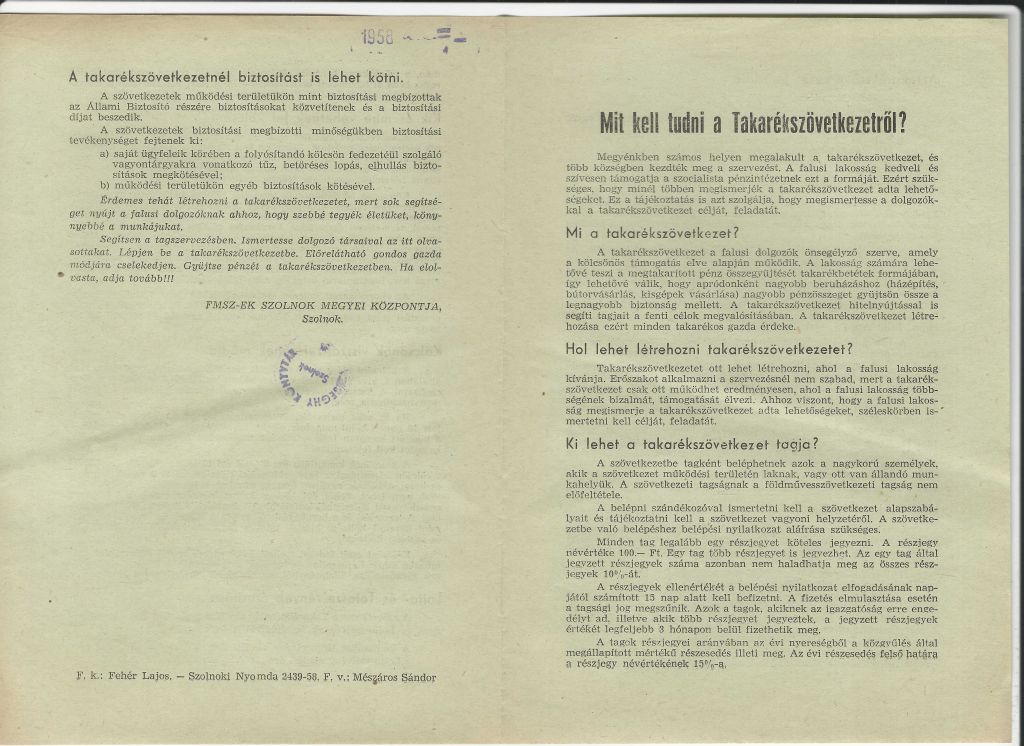 Az FMSZ-ek Szolnok megyei központjának szórólapja "Mit kell tudni a Takarékszövetkezetekről?" címmel