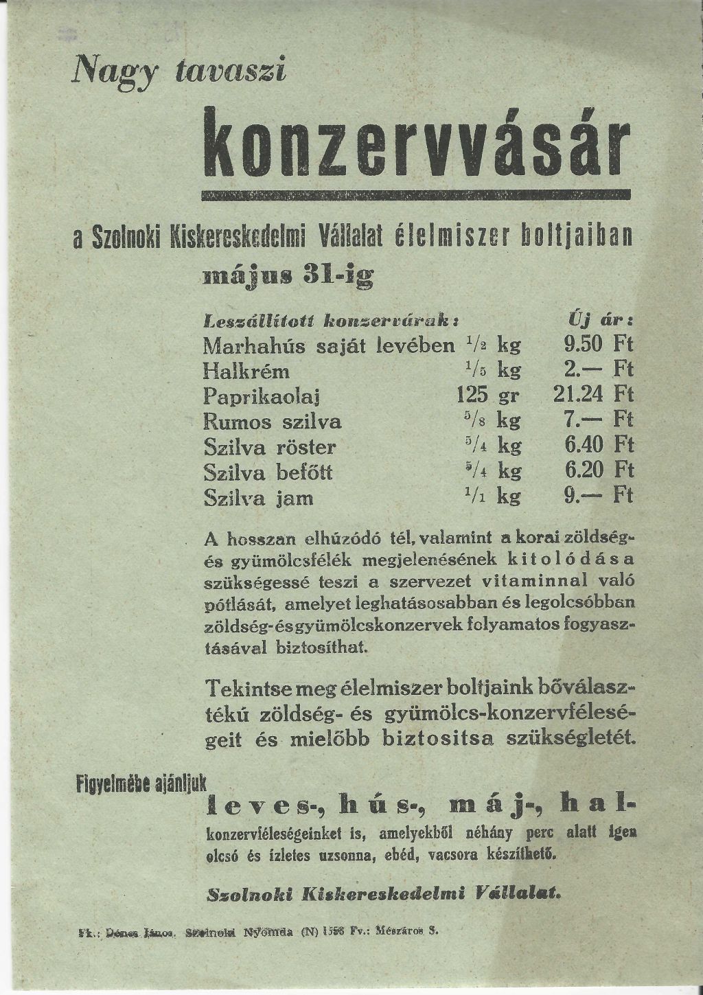 Nagy tavaszi konzervvásár a szolnoki Kiskereskedelmi Vállalat élelmiszer boltjaiban