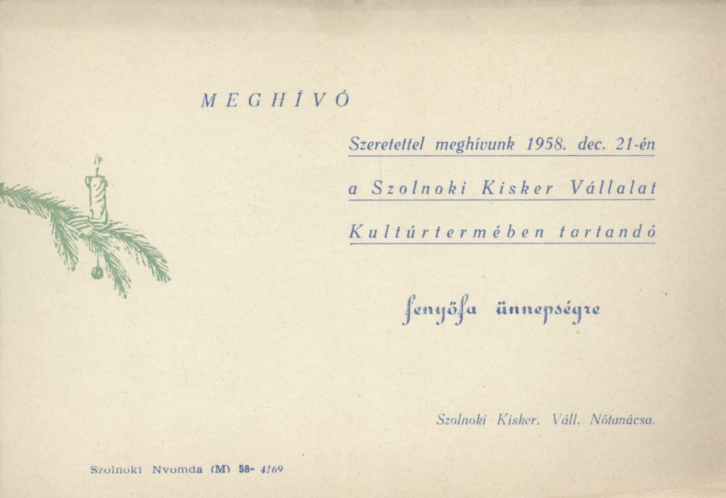 Szolnoki Kiskereskedelmi VállalatA szolnoki Kisker Vállalat meghívója Fenyőfa ünnepségre