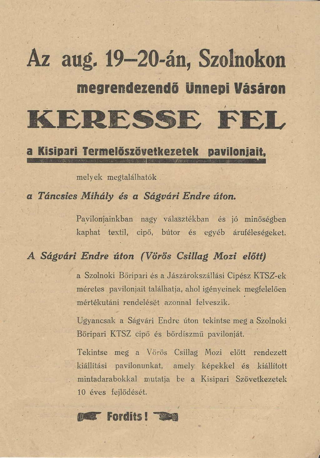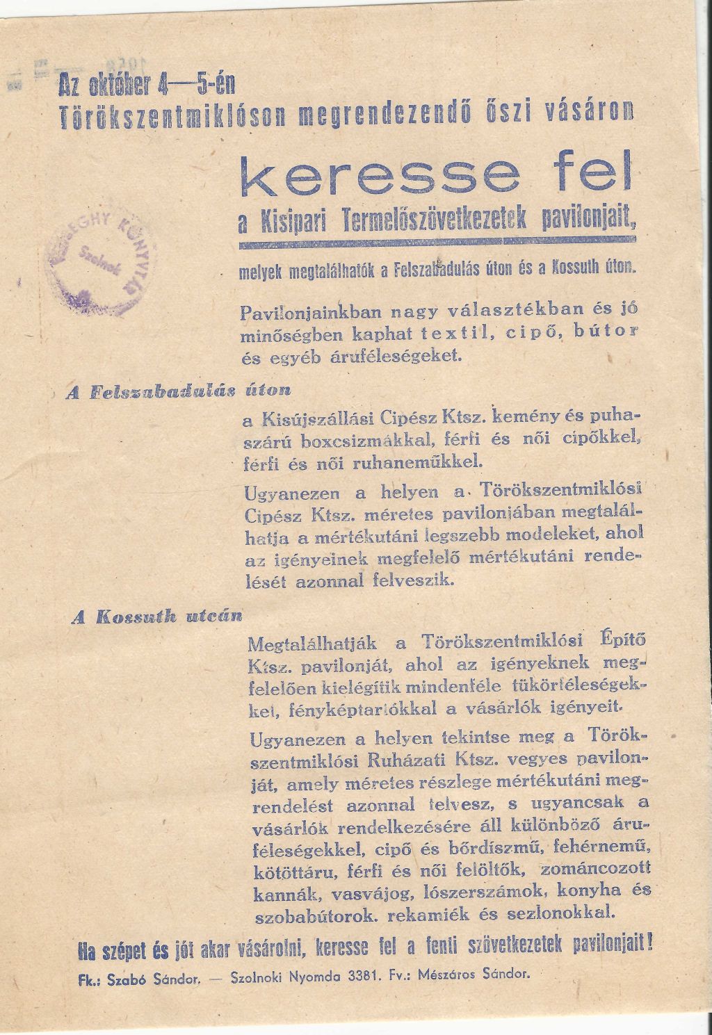 A túrkevei Földművesszövetkezet és a Kisipari Termelőszövetkezet által rendezett szövetkezeti vásár szórólapja