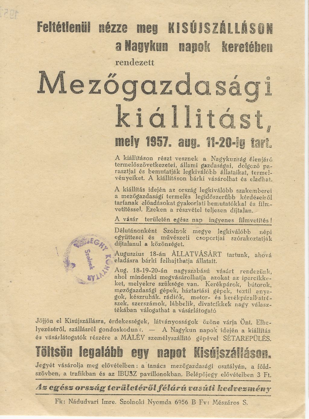 1957Mezőgazdasági kiállítás a Nagykun napok keretében Kisújszálláson, 1957. augusztus 11-20. között